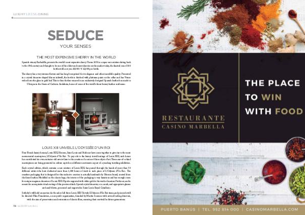 The sherry has a very intense flavour and has long been prized for its elegance and other incredible quality. Presented in a crystal decanter shaped like an inkwell, the bottle is finished with platinum paint on the collar and has Versos etched into the glass in gold leaf. This is then further encased in an exclusively designed Spanish leather box made in Ubrique in the Sierra of Cadiz in Andalusia, home of some of the world’ s finest luxury leather craftsmen.