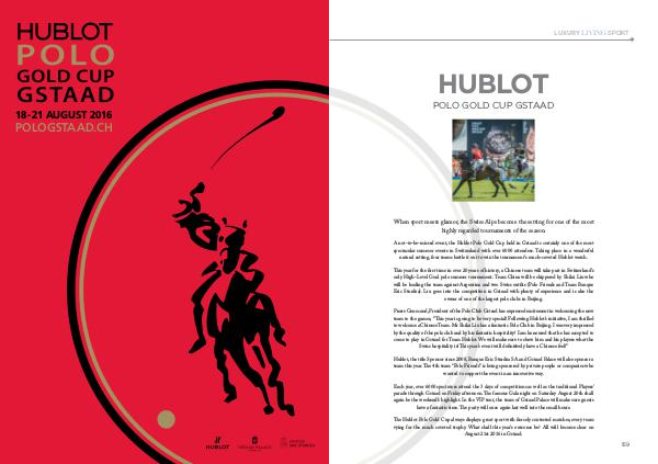Pierre Genecand, President of the Polo Club Gstaad has expressed excitement in welcoming the new team to the games,“ This year is going to be very special! Following Hublot’ s initiative, I am thrilled to welcome a Chinese Team. Mr Shilai Liu has a fantastic Polo Club in Beijing. I was very impressed by the quality of the polo club and by his fantastic hospitality! I am honoured that he has accepted to come to play in Gstaad for Team Hublot. We will make sure to show him and his players what the Swiss hospitality is! This year’ s event will definitively have a Chinese feel!”
