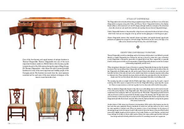 When we talk about Chippendale furniture today, what we are really talking about is well-constructed, midto late-18th century furniture of the Chippendale style. Wood used in this style of furniture was primarily manufactured from mahogany which was imported from the West Indies. Chippendale generally favoured solid wood because it better accommodated the detailed carving of the furniture style. Though veneers were used for furniture of this period, they are not typical of the Chippendale style. Modern reproductions of the Chippendale style will often be hand carved but will not have the depth and detail of carving that the genuine 18th century furniture has.