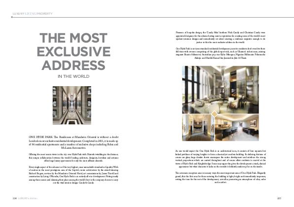ONE HYDE PARK: The Residences at Mandarin Oriental is without a doubt London’ s most exclusive residential development. Completed in 2011, it is made up of 86 residential apartments and a number of exclusive shops including Rolex and McLaren Automotive.