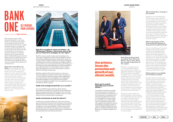 Bank One is one of the leading banks in Africa when it comes to Securities Services , and effectively leverages its access to several markets across the continent . With specific knowledge and experience of the African markets , our Private Banking professionals are able to address the complex and diverse needs of clients seeking investment in Africa , as well as our African clients wishing to invest in major international financial markets . We see ourselves as the bank of choice for clients wishing to invest and trade African Eurobonds , and requiring cross-border investment solutions .