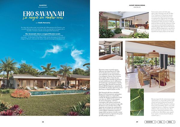 Eko Savannah where a magical lifestyle awaits A new exclusive address has emerged at the foothill of La Tourelle mountain … In the heart of the West coast , at the doorsteps of the vibrant village of Tamarin , discover the resort , club & Conciergerie Ekô Savannah .