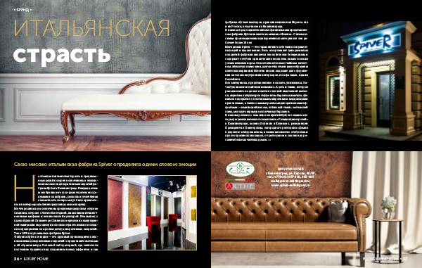 фабрика обучает мастеров, приезжающих как из Европы, так и из России, в том числе из Калининграда. В нашем городе единственным официальным представителем фабрики Spiver является компания « Италия ». С итальянскими производителями декоративных материалов она работает более 15 лет. Материалы Spiver— это гармоничное сочетание современных идей и вдохновения. Весь ассортимент декоративных покрытий фабрики является экологически безвредным и содержит летучие органические вещества намного ниже установленных норм. Они отличаются высочайшим качеством, лёгкостью нанесения, долговечностью и разнообразием цветовых вариаций. Многие из них подходят для оформления не только внутренних интерьеров, но и фасадов, и даже бассейнов. Все материалы, представленные в салоне, уникальны. Зачастую аналогов найти невозможно. А есть и такие, которые раньше никто не делал: пластик с полной имитацией металла, акриловая штукатурка с эффектом бархата и жемчуга, финишное покрытие с песочными микронами и мерцающими кристаллами, а также самыми разными декоративными эффектами— имитацией железа, шёлковой ткани, застывшей лавы, молодого мрамора и песчаных барханов. В нашем регионе с помощью покрытий Spiver созданы интерьеры развлекательного комплекса « Резиденция королей » в Калининграде, казино Sobranie в Куликово, резиденции Президента в Пионерском, загородного ресторана « Домик в деревне » в Моршанском, а также множество статусных и просто красивых площадок, от ресторанов и салонов до респектабельных частных домов. LH