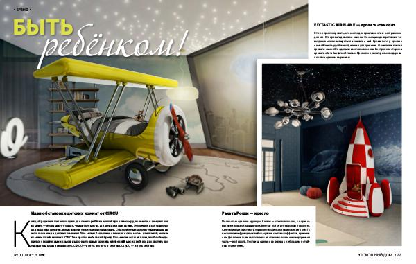 Это не просто кровать, это место для креативности и воображение для игр. Эта кровать довольно высока. С помощью декоративных чемоданов можно взбираться и слезать с неё. Кроме того, у крыльев самолёта есть удобные отделения для хранения. Фюзеляж и крылья кровати-самолёта сделаны из стекловолокна. Внутренняя сторона кровати обита бархатной тканью. Пропеллер из натурального дерева, а колёса сделаны из резины.