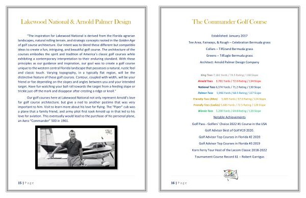 Our golf courses here at Lakewood National not only represent Arnold ’ s love for golf course architecture , but give a nod to another pastime that was very important to him . Visit to learn more about his love for flying . The “ Piper ” cub was a plane that a family friend , and army pilot first took Arnold up in that led to his love for aviation . This eventually would lead to the purchase of his personal plane , an Aero “ Commander ” 500 in 1961 .