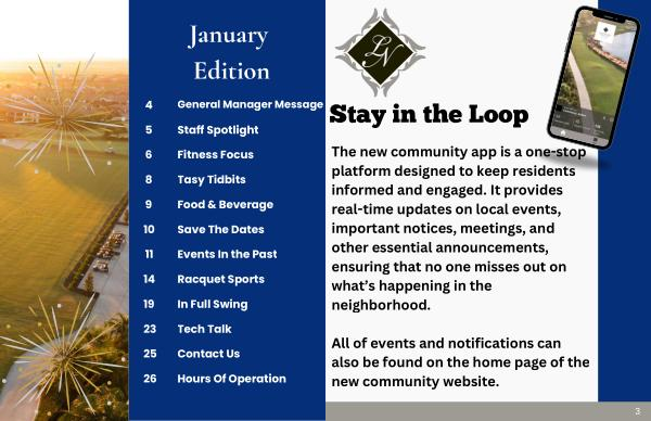 General Manager Message Staff Spotlight Fitness Focus Tasy Tidbits Food & Beverage Save The Dates Events In the Past Racquet Sports In Full Swing Tech Talk 25 Contact Us 26