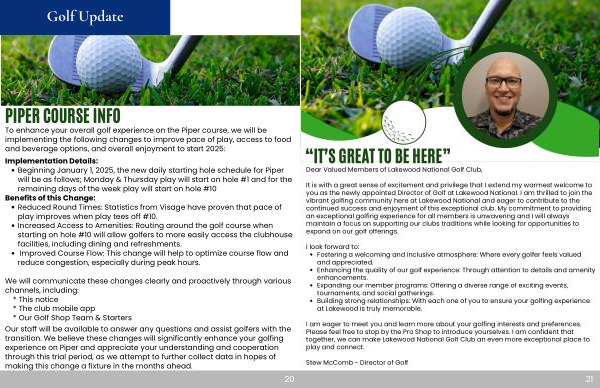 To enhance your overall golf experience on the Piper course , we will be implementing the following changes to improve pace of play , access to food and beverage options , and overall enjoyment to start 2025 :