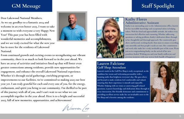 Dear Lakewood National Members , As we say goodbye to a fantastic 2024 and welcome in an even better 2025 , I want to take a moment to wish everyone a very Happy New Year ! This past year has been filled with wonderful memories and accomplishments , and we are truly excited for what the new year has in store for the residents of Lakewood National . From continued growth and exciting events to strengthening our vibrant community , there is so much to look forward to in the year ahead . We have an array of activities and initiatives lined up that will foster even greater connections among residents , provide new opportunities for