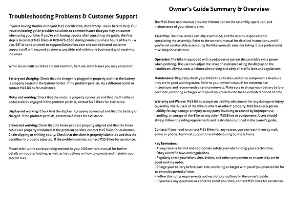 Please refer to the corresponding sections in your M2S owner's manual for further details on troubleshooting, as well as instructions on how to operate and maintain your electric bike.