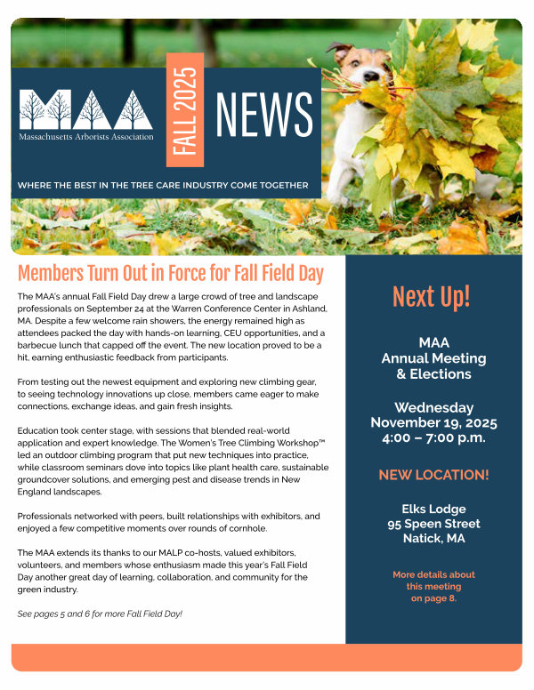 The MAA’ s annual Fall Field Day drew a large crowd of tree and landscape professionals on September 24 at the Warren Conference Center in Ashland, MA. Despite a few welcome rain showers, the energy remained high as attendees packed the day with hands-on learning, CEU opportunities, and a barbecue lunch that capped off the event. The new location proved to be a hit, earning enthusiastic feedback from participants.