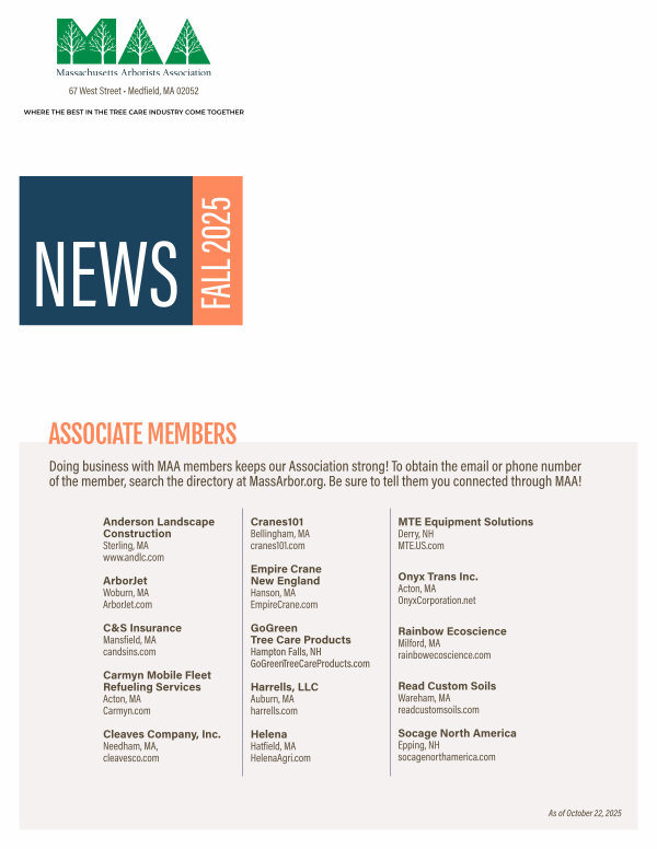 Doing business with MAA members keeps our Association strong! To obtain the email or phone number of the member, search the directory at MassArbor. org. Be sure to tell them you connected through MAA!