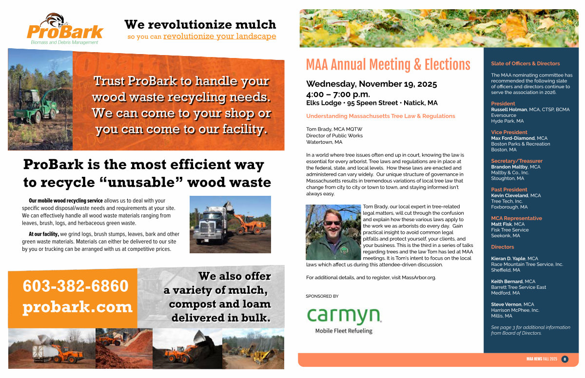 Tom Brady, our local expert in tree-related legal matters, will cut through the confusion and explain how these various laws apply to the work we as arborists do every day. Gain practical insight to avoid common legal pitfalls and protect yourself, your clients, and your business. This is the third in a series of talks regarding trees and the law Tom has led at MAA meetings. It is Tom’ s intent to focus on the local laws which affect us during this attendee-driven discussion.