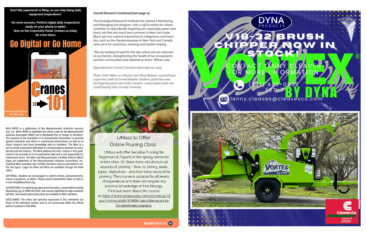 MAA NEWS is a publication of the Massachusetts Arborists Association, Inc. MAA NEWS is published four times a year for the Massachusetts Arborists Association( MAA) and is distributed free of charge to members. The purpose of the newsletter is to disseminate information to promote general standards and ethics in commercial arboriculture, as well as to foster research and share knowledge with its members. The MAA is a not-for-profit corporation dedicated to communications between its membership and the industry. The MAA believes the infor- mation in this publication to be accurate as of its publication date and is not responsible for inadvertent errors. The MAA and Massachusetts Certified Arborist( MCA) logos are trademarks of the Massachusetts Arborists Association, Inc. Qualified MAA members and certified members only are permitted to utilize the logos. Logos for MAA and MCA are available through the MAA office.