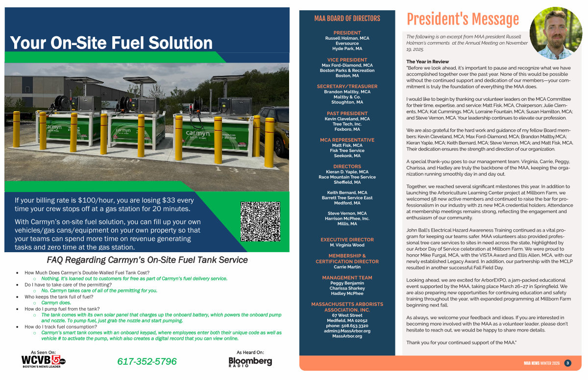 Looking ahead, we are excited for ArborEXPO, a jam-packed educational event supported by the MAA, taking place March 26 – 27 in Springfield. We are also preparing new opportunities for continuing education and safety training throughout the year, with expanded programming at Millborn Farm beginning next fall.