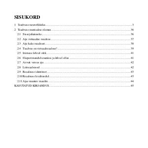 2 Teadvuse mentaalne olemus.......................................................................................................... 36 2.1 Sissejuhatuseks....................................................................................................................... 36 2.2 Aju virtuaalne reaalsus........................................................................................................... 37 2.3 Aju kaks reaalsust................................................................................................................... 38 2.4 Teadvus on virtuaalreaalsus?.................................................................................................. 39 2.5 Inimese ärkvel olek................................................................................................................ 41 2.6 Eksperimendid unenäos ja ärkvel olles.................................................................................. 41 2.7 Arvuti versus aju.................................................................................................................... 42 2.8 Liitreaalsused......................................................................................................................... 42 2.9 Reaalsuse identiteet................................................................................................................ 43 2.10 Reaalsuse kvaliteedid............................................................................................................. 43 2.11 Ajas muutuv maailm.............................................................................................................. 44