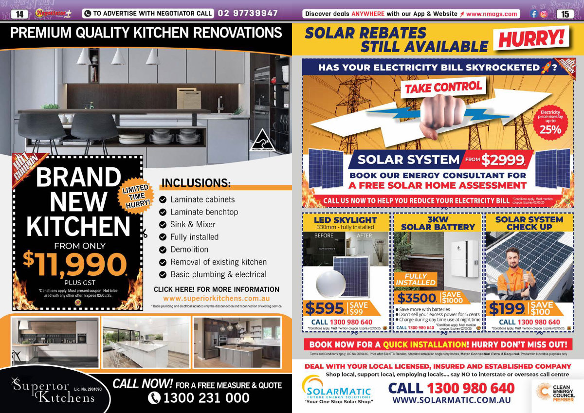 1 • Charge during day time use at night time 1 1 ' Conditions ol) l) ly. Must mention 1 CALL 1300 980 640