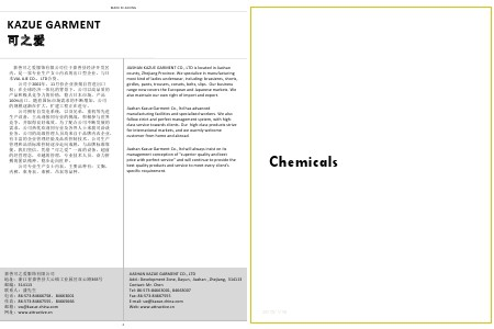 MADE IN JIAXING KAZUE GARMENT 可之爱 嘉善可之爱服饰有限公司位于嘉善县经济开发区 内,是一家专业生产女士内衣的出口型企业,与日 本VAL UJE CO.,LTD合资。 公司于2002年,11月份企业获批自营进出口 权;在全球经济一体化的背景下,公司以高品质的 产品和极具竞争力的价格,稳占日本市场,产品 100%出口。随着