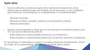 • Sujetos activos específicos: Entes que no son persona en el derecho privado, pero sí lo son para el derecho de petición:
