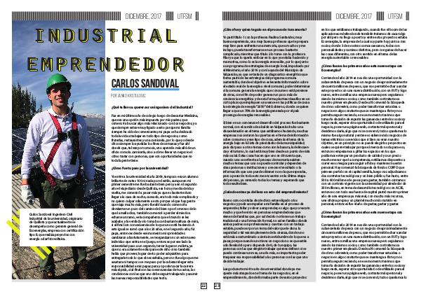 Carlos Sandoval Ingeniero Civil Industrial de la universidad, originario de Quillota y que actualmente se desempeña como gerente general de Ecoenergías, empresa con certificación tipo B, que realiza proyectos con energía solar fotovoltaica.
