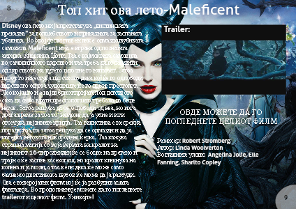 Disney ова лето ни ја претставува „вистинската преказна“ за волшебството и приказната за заспаната убавица. Во овој филм главен лик е одмаздољубивата самовила Maleficent која е играна од познатата актерка Анцелина Џоли. Таа е најмоќната самовила во самовилското царство и таа треба да го заштити од царството на луѓето што тие го напаѓаат. Затоа царот го известува царството дека кој ќе го ослободи царството од тоа чудовиште ќе го добие престолот. Лео кој што и е најдобриот пријател од детството сака да си го врати престолот што требало да биде негов. Затоа решува да се ослободи од неа, но кога доаѓа време за тоа тој неможе да ја убие и и ги отсечува нејзините крилја. Таа навистина е несреќна поради тоа, па затоа решува да се одмазди и да ја маѓепса неговата новородена ќерка. Таа кажува страшна магија со која ќерката на кралот на нејзиниот 16-ти роденден ќе се боцне на вретено и трајн о ќе заспие засекогаш, но кралот клекнува на колена и ја моли, а таа вели дека ќе може само бакнеж од вистинска љубов ќе може да ја разбуди. Ова е неверојатен филм кој ќе ја разбуди вашата фантазија. Во продолженије можете да го погледнете trailerот и целиот филм. Уживајте!