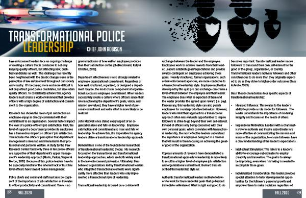 exchange between the leader and the employee . Employees work to achieve rewards from their leader . Leaders establish goals / expectations and provide awards contingent on employees achieving those goals . Heavily structured , formal organizations , such as law enforcement agencies , are more conducive to a transactional leadership style . Employee motivation developed by this quid pro quo exchange can create a level of trust between the employee and their leader . The employee does what is expected of them and the leader provides the agreed upon reward ( i . e . pay ). If necessary , this leadership style can also punish employees for counterproductive behaviors . However , leaders who limit their approach to a transactional approach often miss valuable opportunities to inspire followers to strive to go beyond their own self-interest . Instead of officers only being concerned with their own personal goals , which correlates with transactional leadership , the most effective leaders understand the importance of employees being led in a manner that will result in them focusing on achieving the greater good of the organization .
