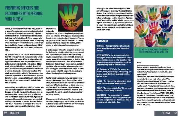 Another study reported that up to 68 % of persons with ASD will display aggressive behaviors at some time . Because of this , it is important for officers to have an awareness of the common indicators of individuals with ASD and how to interact with them . Agencies are encouraged to ensure first responders are provided training on responding to persons who have Autism . This should include how to recognize the behavior , appropriate responses , and familiarization of the different alert systems the agency may use to ensure they have a positive interaction and outcome . While agencies may achieve this through in-service training , Crisis Intervention Training ( CIT ) provides officers with the awareness to identify an issue , skills to de-escalate the incident , and resources to refer individuals to other resources .