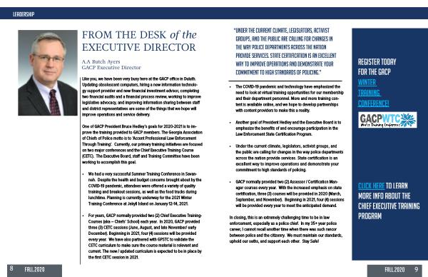 One of GACP President Bruce Hedley ’ s goals for 2020-2021 is to improve the training provided to GACP members . The Georgia Association of Chiefs of Police motto is to ‘ Accent Professional Law Enforcement Through Training ’. Currently , our primary training initiatives are focused on two major conferences and the Chief Executive Training Course ( CETC ). The Executive Board , staff and Training Committee have been working to accomplish this goal .