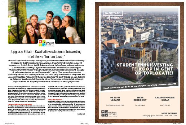 Het Gentse Upgrade Estate is al bijna twintig jaar de grote specialist in kwalitatieve studentenhuisvesting. Inmiddels is het bedrijf ook actief in Bergen, Antwerpen, Brussel en Kortrijk en het zet gestaag zijn expansie voort.“ In Gent, Brugge, Kortrijk, Antwerpen, Brussel, Jette en Bergen stellen we ondertussen 2.200 kamers ter beschikking”, zegt COO Nils Vanhauwaert.“ We behoren niet tot de categorie“ traditionele projectontwikkelaars” maar zijn erg bedreven in het ontwikkelen van doordachte concepten die gedragen worden door een mooi businessmodel”, zegt hij.“ Onze sterkte zit in onze unieke positionering met een forse toegevoegde waarde. Onze focus ligt op betrokkenheid en transparantie voor alle betrokken partijen. Onder het motto“ having the time of your life Upkot” bezorgen we onze studenten een thuisgevoel dankzij onze studentencoaches die voor hen een steun en toeverlaat zijn bij hun vele vragen en twijfels. Als aanspreekpunt mediëren de coaches ook de alledaagse processen.”