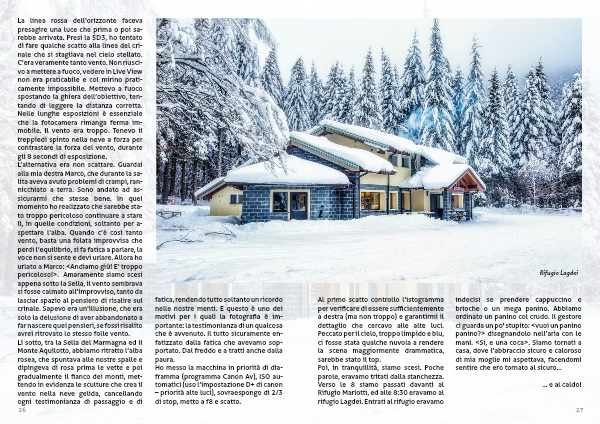La linea rossa dell’orizzonte faceva presagire una luce che prima o poi sa-rebbe arrivata. Presi la 5D3, ho tentato di fare qualche scatto alla linea del cri-nale che si stagliava nel cielo stellato. C’era veramente tanto vento. Non riusci-vo a mettere a fuoco, vedere in Live View non era praticabile e col mirino prati-camente impossibile. Mettevo a fuoco spostando la ghiera dell’obiettivo, ten-tando di leggere la distanza corretta. Nelle lunghe esposizioni è essenziale che la fotocamera rimanga ferma im-mobile. Il vento era troppo. Tenevo il treppiedi spinto nella neve a forza per contrastare la forza del vento, durante gli 8 secondi di esposizione.