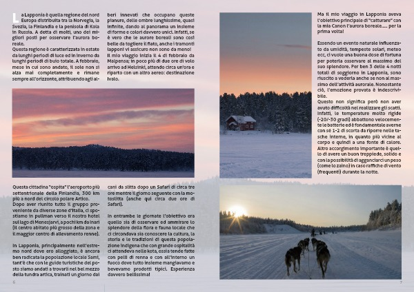 In Lapponia, principalmente nell’estre-mo nord dove ero alloggiato, è ancora ben radicata la popolazione locale Sami, tant’è che con le guide turistiche del po-sto siamo andati a trovarli nel bel mezzo della tundra artica, trainati un giorno dai cani da slitta dopo un Safari di circa tre ore mentre il giorno seguente con la mo-toslitta (anche qui circa due ore di Safari).