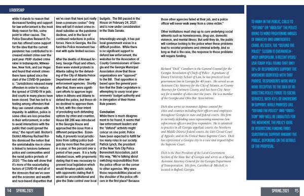 14 SPRING . 2021 we ’ ve seen that have just really been a pressure cooker .” Only time will tell if violent crime indeed subsides as the pandemic declines , and in the face of continued reductions in police forces . Here in Georgia , the Defund the Police movement has met with quite limited success .