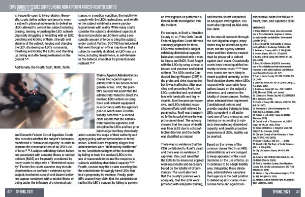Based on the review of the common claims filed in an ARD , administrators are encouraged to keep appraised of the court decisions on the use of force , as it continues to be a high liability area . Integrating these strategies , administrators can place their agency in the best position to defend against claims of excessive force and against administrative claims for failure to direct , train , and supervise LEOs .