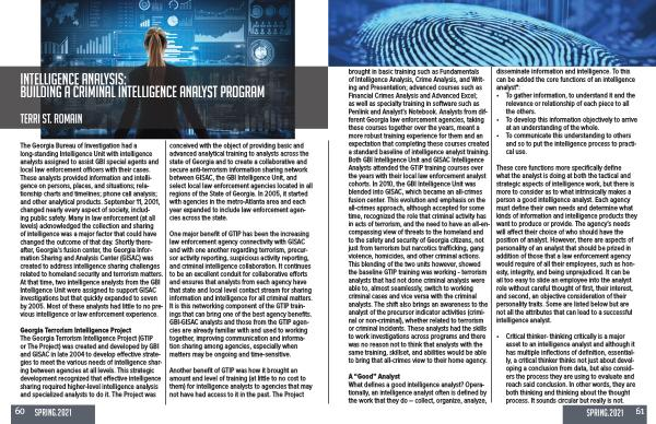 brought in basic training such as Fundamentals of Intelligence Analysis , Crime Analysis , and Writing and Presentation ; advanced courses such as Financial Crimes Analysis and Advanced Excel ; as well as specialty training in software such as Penlink and Analyst ’ s Notebook . Analysts from different Georgia law enforcement agencies , taking these courses together over the years , meant a more robust training experience for them and an expectation that completing these courses created a standard baseline of intelligence analyst training . Both GBI Intelligence Unit and GISAC Intelligence Analysts attended the GTIP training courses over the years with their local law enforcement analyst cohorts . In 2010 , the GBI Intelligence Unit was blended into GISAC , which became an all-crimes fusion center . This evolution and emphasis on the all-crimes approach , although accepted for some time , recognized the role that criminal activity has in acts of terrorism , and the need to have an all-encompassing view of threats to the homeland and to the safety and security of Georgia citizens , not just from terrorism but narcotics trafficking , gang violence , homicides , and other criminal actions . This blending of the two units however , showed the baseline GTIP training was working - terrorism analysts that had not done criminal analysis were able to , almost seamlessly , switch to working criminal cases and vice versa with the criminal analysts . The shift also brings an awareness to the analyst of the precursor indicator activities ( criminal or non-criminal ), whether related to terrorism or criminal incidents . These analysts had the skills to work investigations across programs and there was no reason not to think that analysts with the same training , skillset , and abilities would be able to bring that all-crimes view to their home agency .