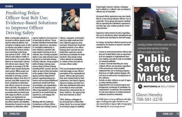 While considerable attention is focused on officer injuries resulting from physical attacks , few recognize a leading cause of officer injuries and death is automobile accidents . Previous studies have found that in the threeyear period of 2017 – 2019 , 138 officers were killed in traffic-related incidents . For every officer killed in an automobile collision , 234 officers were injured . That suggests an average of 10,764 officers were injured during the same period . While proper use of seat belts can increase the potential of surviving a potentially fatal collision from 44 to 73 percent , very little research has been conducted to determine why officers choose to not wear their seat belts . The purpose of this study was to identify factors associated with increased seat belt usage by officers so police leaders can implement evidence-based strategies to reducing officer injuries and fatalities . Researchers focused on six characteristics to determine which may be related to increased use of seat belts by officers . These include individual characteristics ( gender , experience , education , in committed relationship or have children ), impulsive attitudes ( belief of being at risk of collision , fear of being assaulted while in car ), risky behaviors ( use cell phone or text while driving , off-duty collisions , being stopped while off-duty ), training experiences ( level of driver training including EVOC , pursuit , and simulator as well as their perception of the quality of their training ), agency policies ( department policies regarding driving behaviors and perceived likelihood supervisors would hold them accountable ), and organizational characteristics ( agency had officer injured / killed in accident , perceive to be treated fairly by supervisors , and engage the community better ).