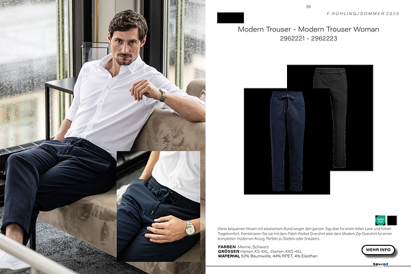 Diese bequemen Hosen mit elastischem Bund sorgen den ganzen Tag über für einen tollen Look und hohen Tragekomfort . Kombinieren Sie sie mit dem Patch Pocket Overshirt oder dem Modern Zip Overshirt für einen kompletten modernen Anzug . Perfekt zu Stiefeln oder Sneakers .