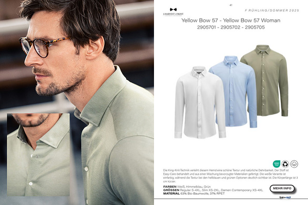 FARBEN Weiß , Himmelblau , Grün GRÖSSEN Regular S-4XL , Slim XS-2XL , Damen Contemporary XS-4XL MATERIAL 63 % Bio-Baumwolle , 37 % RPET