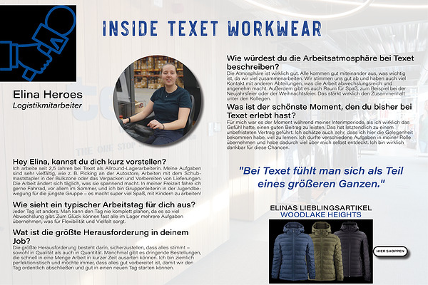 Ich arbeite seit 2,5 Jahren bei Texet als Allround-Lagerarbeiterin . Meine Aufgaben sind sehr vielfältig , wie z . B . Picking an der Autostore , Arbeiten mit dem Schubmaststapler in der Bulkzone oder das Verpacken und Vorbereiten von Lieferungen . Die Arbeit ändert sich täglich , was sie spannend macht . In meiner Freizeit fahre ich gerne Fahrrad , vor allem im Sommer , und ich bin Gruppenleiterin in der Jugendbewegung für die jüngste Gruppe – es macht super viel Spaß , mit Kindern zu arbeiten !