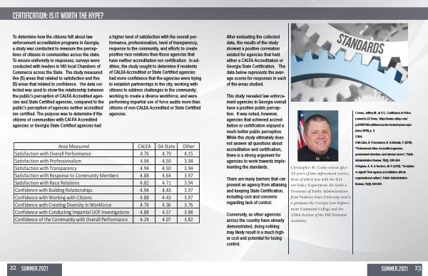 To determine how the citizens felt about law enforcement accreditation programs in Georgia , a study was conducted to measure the perceptions of citizens in communities across the state . To ensure uniformity in responses , surveys were conducted with leaders in 140 local Chambers of Commerce across the State . The study measured five ( 5 ) areas that related to satisfaction and five ( 5 ) areas that related to confidence . The data collected was used to show the relationship between the public ’ s perception of CALEA Accredited agencies and State Certified agencies , compared to the public ’ s perception of agencies neither accredited nor certified . The purpose was to determine if the citizens of communities with CALEA Accredited agencies or Georgia State Certified agencies had a higher level of satisfaction with the overall performance , professionalism , level of transparency , response to the community , and efforts to create positive race relations than those agencies that have neither accreditation nor certification . In addition , the study sought to determine if residents of CALEA Accredited or State Certified agencies had more confidence that the agencies were trying to establish partnerships in the city ; working with citizens to address challenges in the community ; working to create a diverse workforce ; and were performing impartial use of force audits more than citizens of non-CALEA Accredited or State Certified agencies .