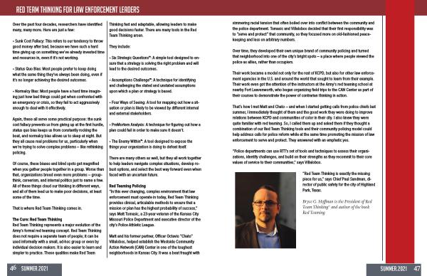 Red Teaming Policing “ In this ever changing , complex environment that law enforcement must operate in today , Red Team Thinking provides clinical , articulable methods to ensure that a mission or plan has the highest probability of success ,” says Matt Tomasic , a 23-year veteran of the Kansas City Missouri Police Department and executive director of the city ’ s Police Athletic League .
