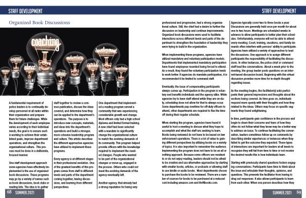 68 SUMMER . 2021 staff together to review a common publication , discuss the ideas covered , and determine how they can be applied to the department ’ s operations . The purpose is to introduce new concepts , materials , and ideas into the department ’ s operations and build a stronger , more cohesive leadership program and culture . This article describes the different approaches agencies have utilized to implement these programs .