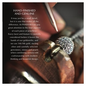 It may just be a small detail, but it is one that makes all the difference. At PANDORA we pay great attention to the finer aspects of each piece of jewellery: Every facet and feature is carefully considered before it leaves the hands of our goldsmiths, and we use 14k/18k gold, sterling silver and carefully selected gemstones, stones and pearls when combining century-old craftsmanship with modern thinking and beautiful design.