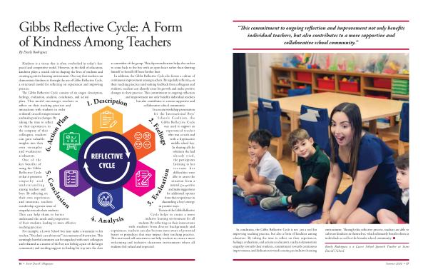 In addition , the Gibbs Reflective Cycle also fosters a culture of continuous improvement among teachers . By regularly reflecting on their teaching practices and seeking feedback from colleagues and students , teachers can identify areas for growth and make positive changes to their practice . This commitment to ongoing reflection and improvement not only benefits individual teachers but also contributes to a more supportive and collaborative school community . In a recent workshop presentation for the International Boys ’