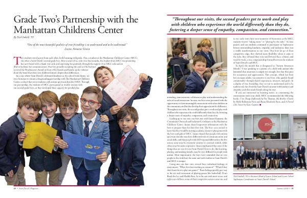 Going into our first visit , several boys verbalized feelings of anxiousness : “ What if we have nothing in common ?” “ What if they don ’ t know how to play our games ?” These feelings quickly gave way to the joy and excitement of playing games like basketball , Don ’ t Break the Ice , and Marble Run . As is the case with most seven- and eight-year-old boys , some of their competitive nature came out , and in our early visits there were moments of frustration as the MCC students weren ’ t “ taking turns ” or “ playing by the rules .” As time passed , and our students continued to participate in Sophrosyne lessons surrounding kindness , empathy , and inclusion , there was a visible transformation in our visits . Our boys let go of their competitive edge , they showed more flexibility when it came to the rules , they softened their tone ( and lowered their volume ), and week by week , a true companionship formed between the students of Saint David ’ s and MCC .