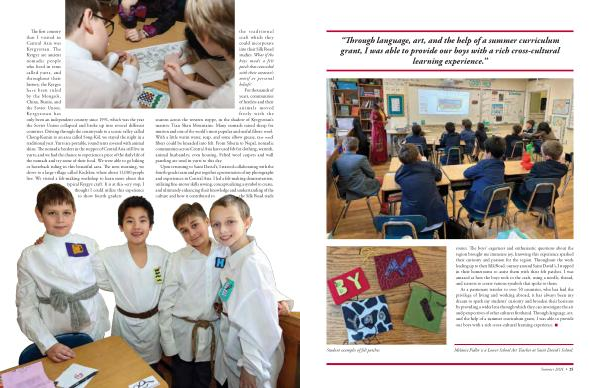 Upon returning to Saint David ’ s , I started collaborating with the fourth-grade team and put together a presentation of my photographs and experiences in Central Asia . I led a felt-making demonstration , utilizing fine-motor skills sewing , conceptualizing a symbol to create , and ultimately enhancing their knowledge and understanding of the culture and how it contributed to the Silk Road trade