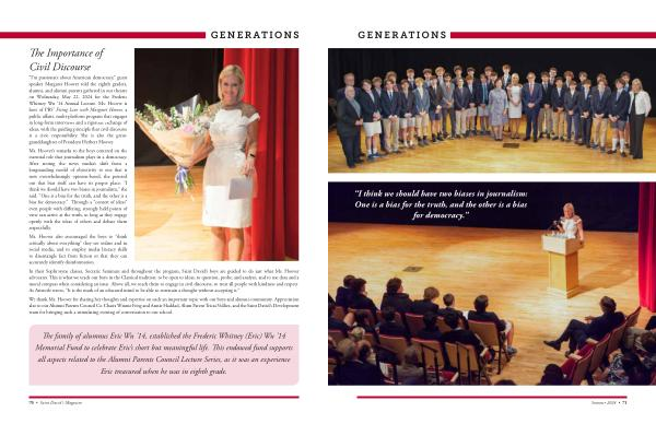“ I ’ m passionate about American democracy ,” guest speaker Margaret Hoover told the eighth graders , alumni , and alumni parents gathered in our theatre on Wednesday , May 22 , 2024 for the Frederic Whitney Wu ’ 14 Annual Lecture . Ms . Hoover is host of PBS ’ Firing Line with Margaret Hoover , a public affairs , multi-platform program that engages in long-form interviews and a rigorous exchange of ideas , with the guiding principle that civil discourse is a civic responsibility . She is also the greatgranddaughter of President Herbert Hoover .