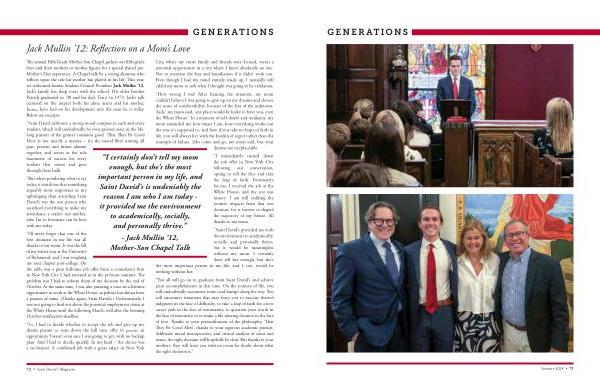 “ I certainly don ’ t tell my mom enough , but she ’ s the most important person in my life , and Saint David ’ s is undeniably the reason I am who I am today - it provided me the environment to academically , socially , and personally thrive .”