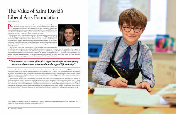 To educate means literally“ to lead out” but might better be understood as leading towards and, in the case of Saint David’ s School, this means leading students towards becoming“ good men.” As parents, we know this is not an easy task, and we count on the school to do what it can uniquely do. Teachers make this happen, spending their days interacting with students in classrooms and their evenings and weekends planning for these interactions and responding to students’ work with meaningful feedback that leads towards our shared and common goals.