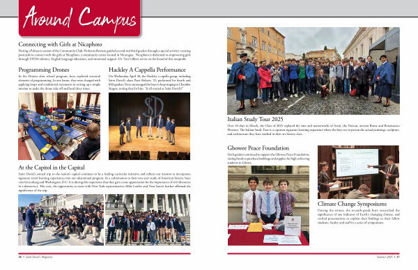 Unusually for a middle school, Saint David’ s Latin curriculum begins in fifth grade, with a measured introduction that touches on concepts such as grammatical case and verb tense. Students acquire a vocabulary of about 100 words this first year, and there is frequent comparison with Spanish, both in vocabulary and in grammatical structures( which are remarkably similar in the two languages). Students, especially younger students, are fascinated by the realia- the material remains- and the classes are richly illustrated through Smartboard presentations and many supplementary exercises.