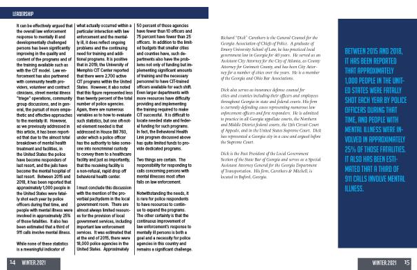 14 WINTER . 2021 what actually occurred within a particular interaction with law enforcement and the mentally ill , it does reflect ongoing problems and the continuing need for training and additional programs . It is positive that in 2019 , the University of Memphis CIT Center reported that there were 2,700 active CIT programs within the United States . However , it also noted that this figure represented less than twenty percent of the total number of police agencies . Again , there are numerous variables as to how to evaluate such statistics , but one oft-noted element needed is that addressed in House Bill 760 , under which a police officer has the authority to take someone into noncriminal custody to convey them to a healthcare facility and just as importantly , that the receiving facility is a non-refusal , rapid drop off behavioral health center .