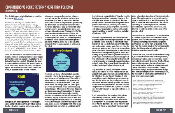 Community policing is a comprehensive philosophy that guides policy and strategy aimed at achieving more effective and efficient crime control , reduced fear of crime , improved quality of life , and improved police services and police legitimacy through a proactive reliance on community resources that seeks to change crime causing conditions . This assumes a need for greater accountability of police , elected community leaders , and the community in general , along with greater public share in decision-making through the identification of service needs and priorities and a greater concern for civil rights and liberties ( IACP 2019 ). infrastructure , parks and recreation , voluntary associations , and the private sector . Local government services have as much to do with the production of crime as the police and typically they are absent from any press conference on crime . Therefore , it behooves local government to offer a comprehensive approach to crime issues and not leave it to police alone ( Friedmann 2015 ). This is not meant to marginalize police . Rather it is meant to bring the other service agencies to play a role alongside the police . If a community wants to minimize police case load it needs to produce less crime . And that is why it is so important to involve all other service providers to take part in this effort .